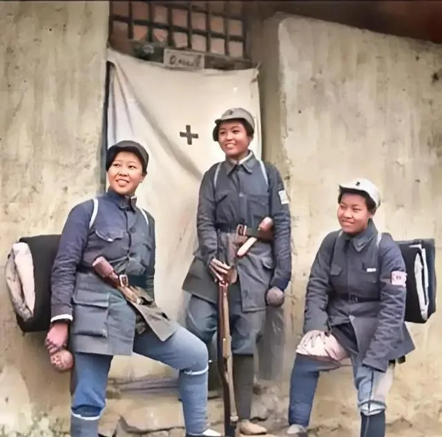 这三个姑娘是卫生队员,袖口上别着红十字,背上铺盖卷鼓鼓的,手里一根木棍当拐杖也当测路的家伙,鞋面纤维冒白丝,笑得大方,妈妈看见这张只说了一句,真能扛,我点点头没再多话。