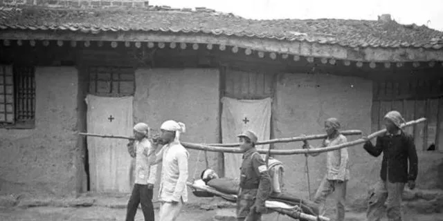这个场景叫抬担架转运,四个人前后抬着,屋檐低,门口挂着红十字布帘,脚步不快不慢,喊一二换肩,巷子里回声跟着走,受伤的那位裹着毯子没出声,大家心里都明白紧要。