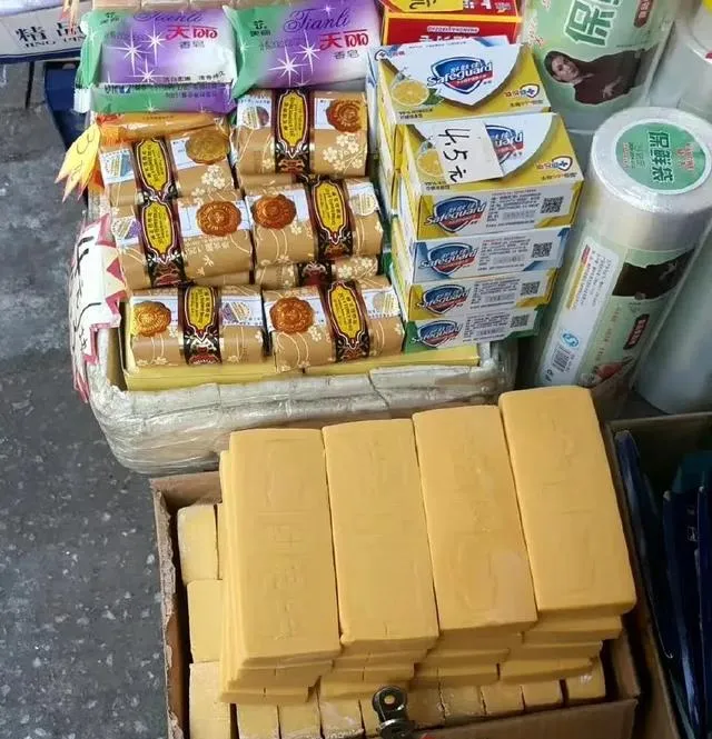 这堆老牌肥皂摆得方方正正,黄块子像小砖,旁边卧着卷装的香皂新面孔,那年头洗衣做饭分得清楚,妈妈说先刮一小片放盆里,水一搅就起沫,冬天手冻得通红,肥皂味却干净得很,现在一按就是液体洗衣凝珠,省事是省事,味道却淡了。