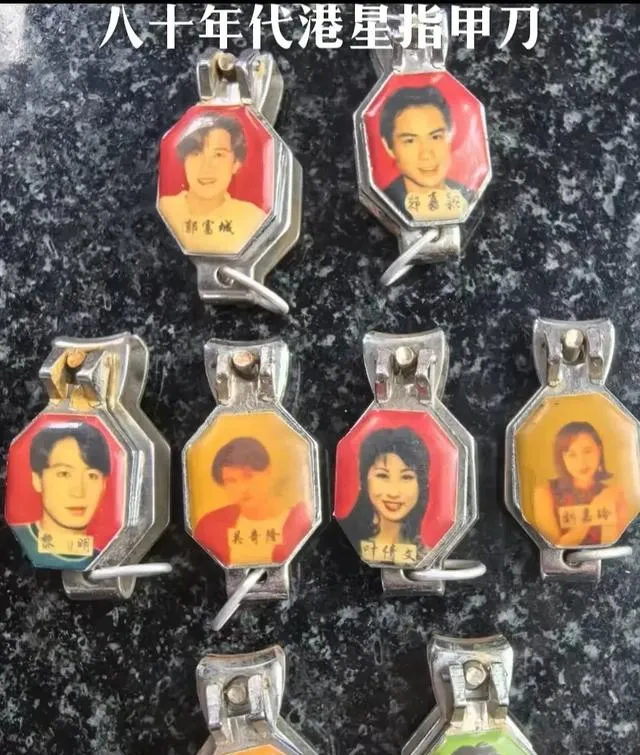 这一排镶照片的指甲刀可热闹,八角形小壳里是当年的银幕面孔,金属边咬合得紧,钥匙串上挂一个走哪都晃,表弟那会儿就盯着谁家的头像好看,借来咔哒几下又还回去,指甲屑擦在裤腿上也不嫌弃,孩子心里图个稀罕。