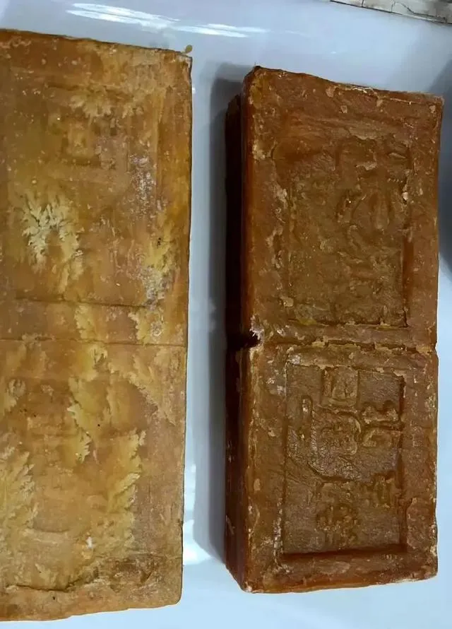这两块发着白霜的老皂块是存货,棱角被岁月磨圆了,面上还能看见模具印,奶奶把它们切成小条儿,旧瓷碗里加点热水泡一会儿,洗头洗衣都能用,她说以前用肥皂水或者淘米水,头发照样黑亮,夏天晾在院子里,一阵风吹过有股子清味。