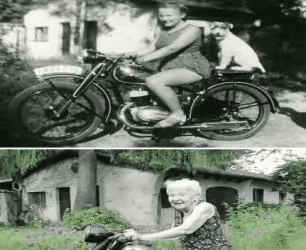 上下一对照有意思,年轻时跨车的笑意和晚年再摸车把的笃定连成一条线,旧屋还在,树影也还是那棵,只是人从急风里走回了慢风里,爸爸笑我爱看这类对比照,说你看,时间不爱喧哗,却总能把人磨得温柔。