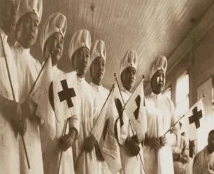 这群身穿白衣的人手里举着带十字的旗,帽檐圆圆的,队列排得齐,屋里窗子高,光打在旗面上有点发亮,有人在后头看热闹,有人抬笔做记录,那时候说救人这件事,不问原因,先上手再说。