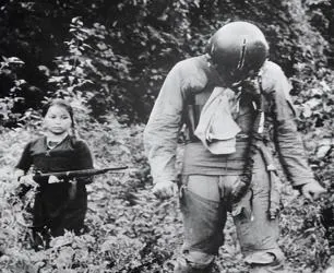 最后这张冲突味道很重,小女孩抓着一杆枪站在草影里,身前的高个男人低着头像被风压弯,树叶沙沙响,脚下泥湿,谁也不说话,只有呼吸声一深一浅地挤在一块儿,那时候的天,总是忽然就阴下来,忽然又亮一回。