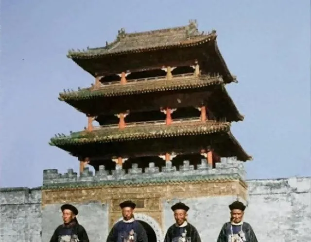 图中这门楼高高在上,檐角挑起像鸟翼,台基厚重,前头站着身穿官服的人,补子一方,乌纱一戴,阳光在绸面上走,远处云淡,近处石阶凉,人走上去心里不免打鼓,规矩就是这么从台阶上一步步抬起来的。