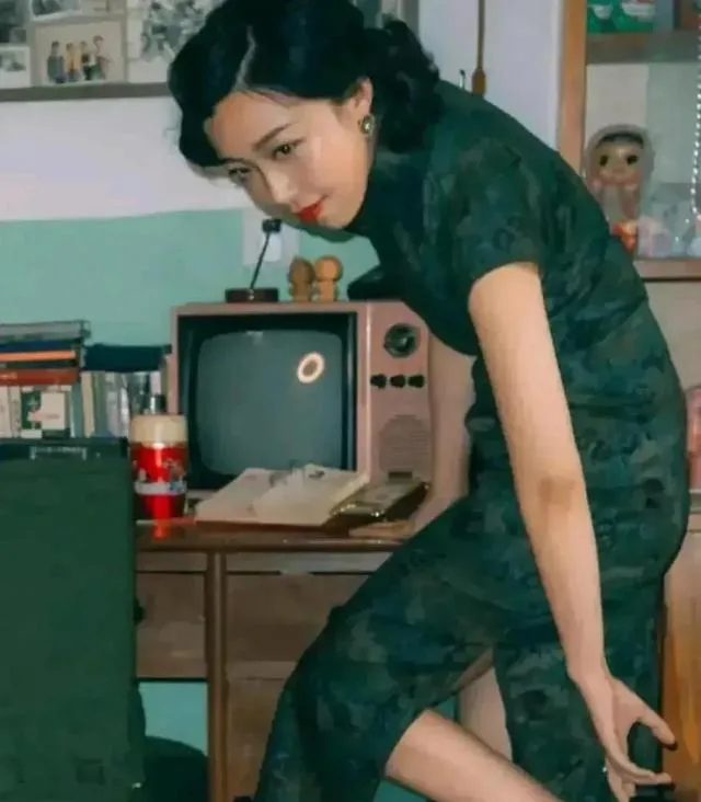 桌上一台小电视,壳是粉色旧塑料,旁边堆了书和玻璃杯,图中弯腰的她穿着暗花旗袍,手指扶着鞋跟像在换鞋,妈妈看见这样的摆设会说,家里那会儿买台电视得攒多久的钱,周末放电影,邻居把小板凳一排一排抬过来,屋里挤得满当当。
