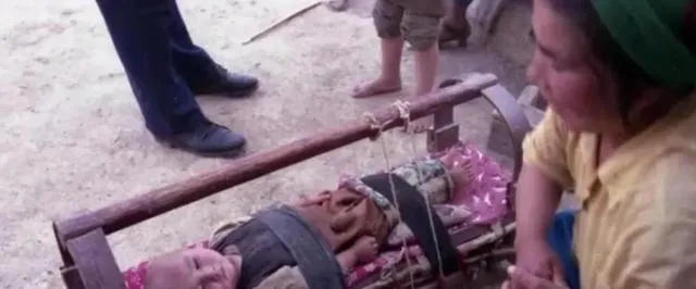 这个木摇篮两边用布带固定着,婴儿被包得稳稳的,旁边的女人双手搭着膝盖看他,乡下人带娃就这样,走亲戚背着,干活时放在树荫下,绳子一拉一放,咿呀两声就睡着,那时候没有早教,睡得踏实就是好。