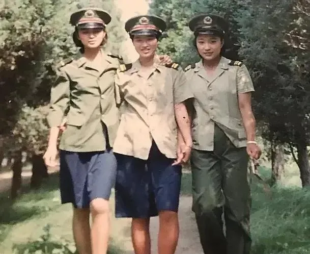 图中三位女兵挽着胳膊走在树下,蓝裙配军帽,笑得像是刚训练完去食堂,脚步带风,那个年代参军的姑娘少见,回村里走一圈,孩子们都追在后头学敬礼呢。