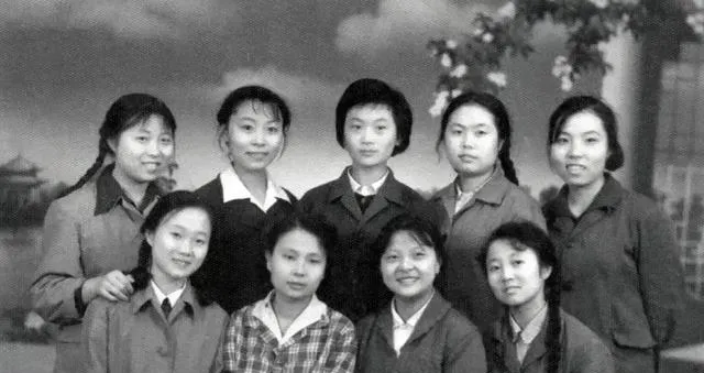 这张九人黑白合影站位规整,辫子不少,衣领扣得齐,背景是画的亭台楼阁,像照相馆固定的幕布,妈妈说当年留影得排队,憋着笑别眨眼,一次就过,底片省着用,几年后翻出来,谁坐哪儿都还记得。