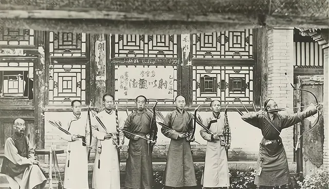 图中这一排人手里的弯弓叫角弓,背厚腹薄,弦紧得像一条黑线,拉满时手臂成月牙,箭羽短硬,贴着指虎滑出去的那一瞬间,院子里只剩嗖的一声,照片里右侧那位正是开弓不回头的范儿,脚尖外撇,腰略前探,像教头在盯你站不站得稳,爷爷说,旧制考侍卫步射得连中三箭,风轻点都不算借口,考场上只认靶心不认人情。