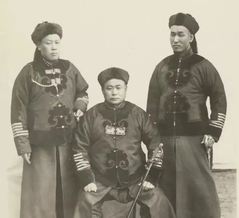 这个短身阔面的腰刀叫佩刀,刀鞘厚重,护手呈弧,贴在袍摆边上像一条冷光的影子,中间坐着那位大马金刀,手背搭在刀首上,整个人稳得像墩子,衣襟上的云纹团寿是门第脸面,妈妈看见照片笑我,别老盯着刀看,人家袖口绦带是一道道军功账,能缠几圈都是有来历的。