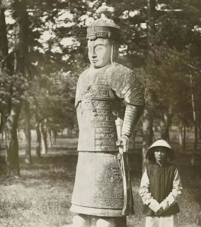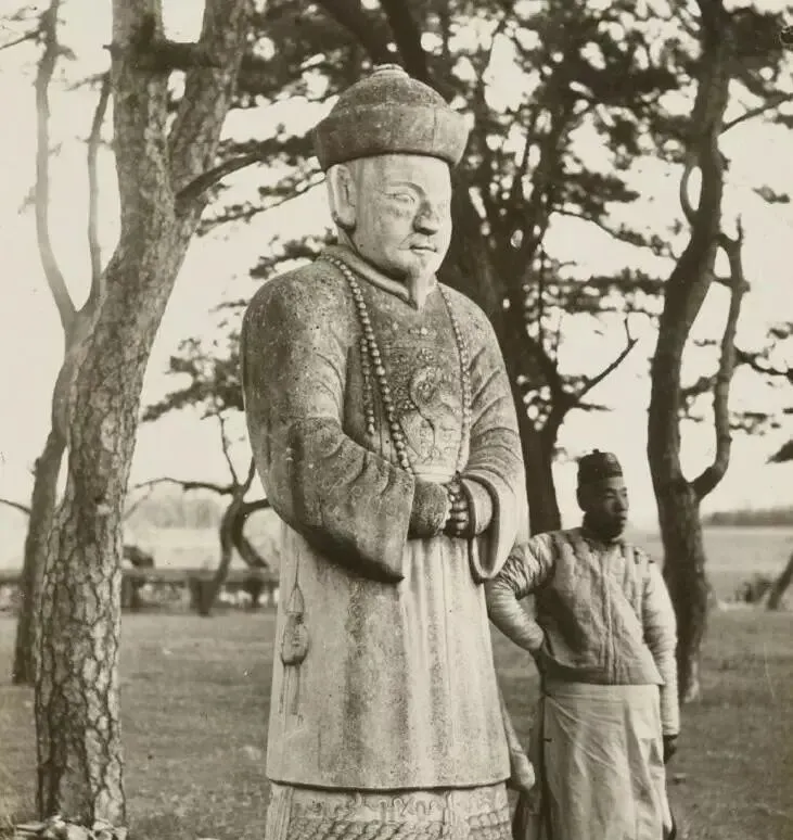 这个圆腹长袍的石像是文臣翁仲,胸前浅浅一方补子,串珠像一串冻住的雨,旁边靠树站的侍卫手插在腰间,半个身子藏在树影里,像是巡道歇口气,话不多,眼神却亮,小时候我去乡间祠堂,看见门口两尊小石人,也学着他这么站,学不来那股沉静,只觉得裤腿被风一掀就想跑。