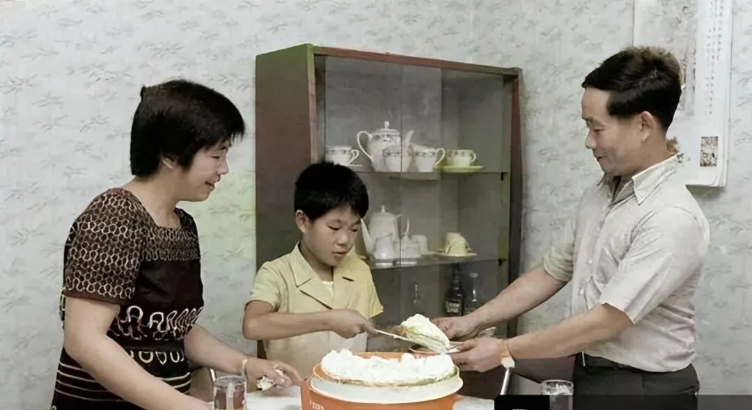图中这桌上那团花边奶油的叫西式生日蛋糕,那会儿不讲究什么千层抹面,圆胚一切开奶香就扑过来,黄色胚底,白色奶油,边上挤着波浪纹,刀子还不太好使,切出来一块歪歪斜斜的照样开心,背后是玻璃餐柜,红木或喷漆框架,前面两扇推拉玻璃门,里头码着成套的瓷壶瓷杯,家里请客的时候就从里面捞一套出来,平常可不舍得动,妈妈笑着说小心别碰碎咯,一只杯子可要攒几个月的票子才能配齐。