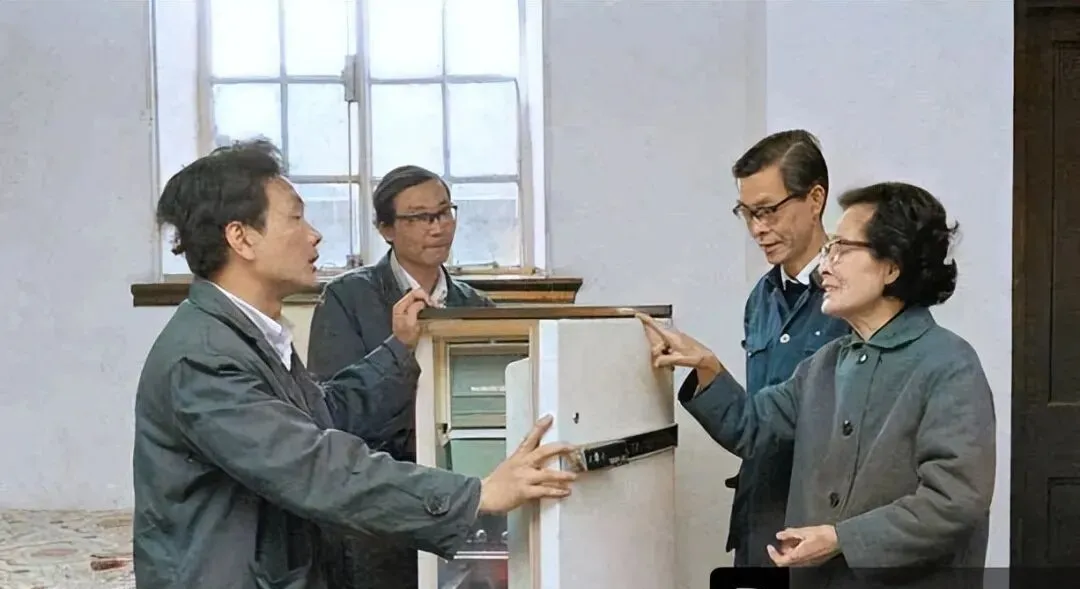 这个白色立柜叫双门电冰箱,上冷冻下冷藏,门把手是黑色横条,开关卡嗒一响,灯泡就亮起来了,最怕的就是夏天突然不制冷,冰激凌化成一滩,照片里这位穿工作服的师傅正在检查压缩机,另一位在一旁解释,阿姨您听这声,像喘不上气似的,就是缺氟了,给您补上再把圈清一清,阿姨连连点头,说可得麻烦你们了,这冰箱里还冷着明天宴客用的啤酒呢,那个年代能请到上门维修,邻居都得探出头来问一句,修好了没,多少钱,心里门儿清,家里有冰箱,待客就是不一样。