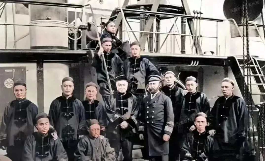 这个甲板上的合影叫老海相,图中水兵穿的是深色对襟袍,扣子一排排,旁边一位洋教官胡须很硬,站姿笔挺,铁梯子直上直下,舰身铆钉密密麻麻,像在说别怂就是干,那时候海风咸得很,照片边角都能闻出金属味儿来。