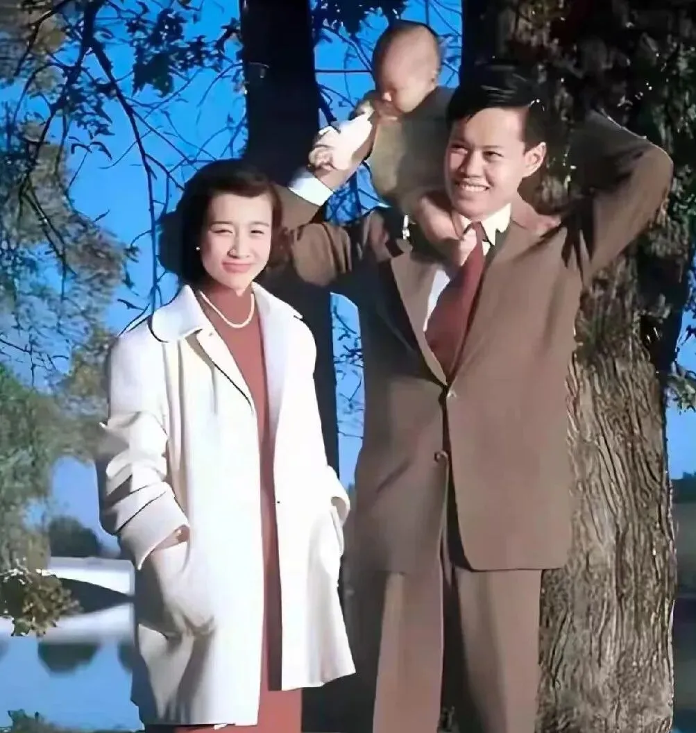 这张草地边的外拍叫家庭照,西装革履配浅色大衣,女人笑得含着光,男人把娃架在肩上,小鞋在他后脑勺上蹭啊蹭,树影斑驳,蓝天净得像水洗过,奶奶看了说早些年拍照都爱端住,可这一家子明显放松了。