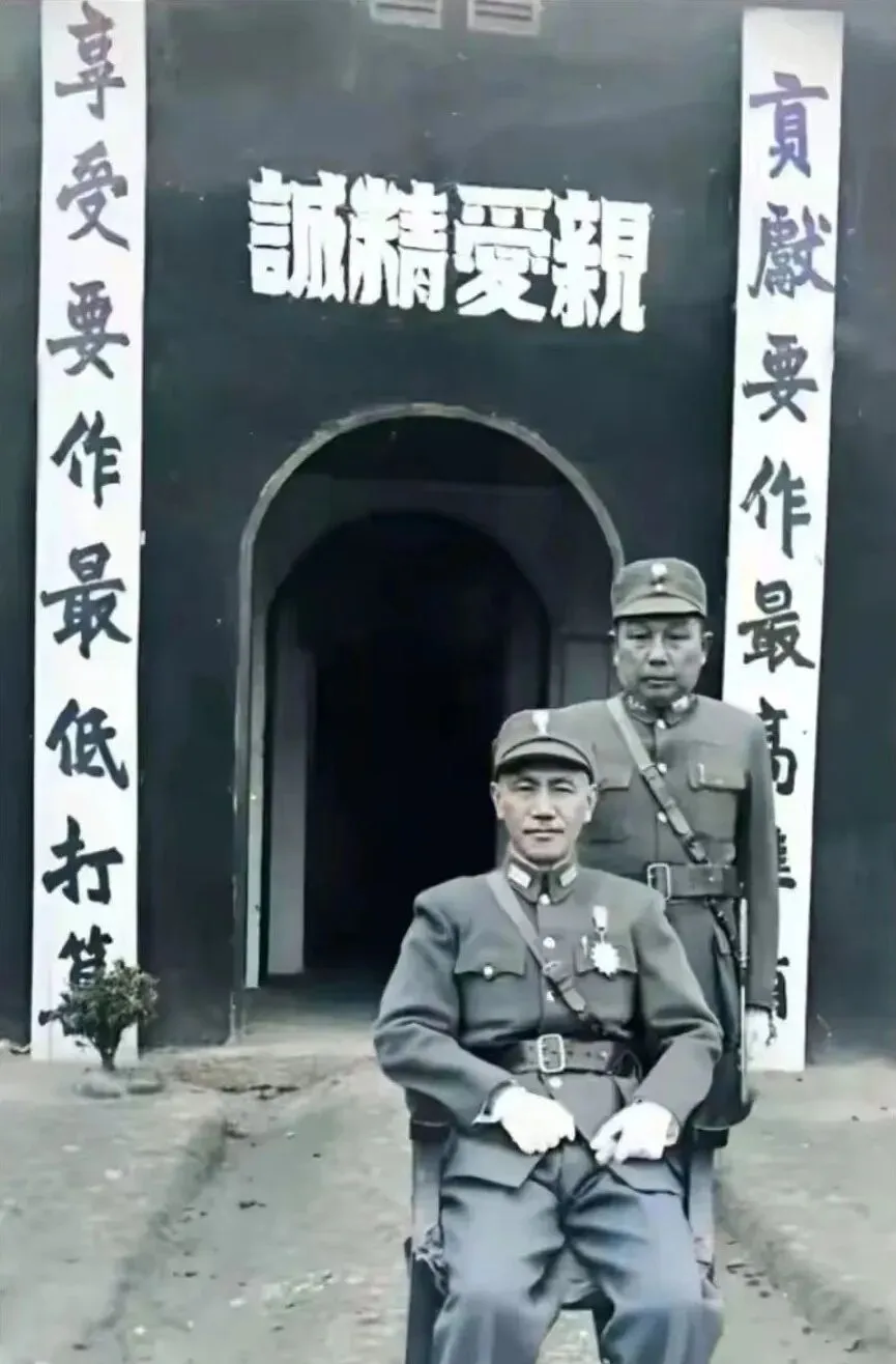 这张门口坐着一位站着一位的照片叫军营留影,黑底白字的标语竖在门柱上,字写得很正,衣扣亮得刺眼,皮带勒得紧紧的,站在后头那位肩膀往前一收,像个不声张的提醒,旧影里透着一股子要紧劲儿。