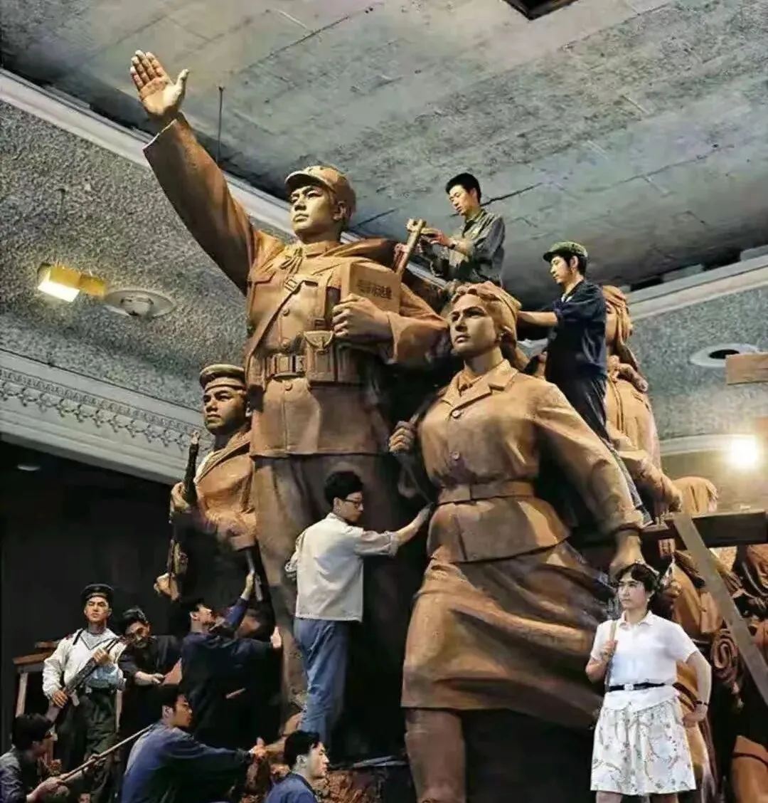 这个正在攀着梯子忙活的叫群雕制作,泥胚子还湿着,刀口一道一道,袖子往上一撸,手背上糊着泥点,人物的衣褶被抻得有劲,抬手的那一尊像在喊话,师傅说做雕像要先定气口,定住了,整组就活了。