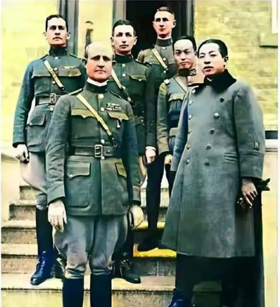 这张台阶上的合影叫出访留影,军靴擦得发亮,风纪扣一颗不落,侧边那位穿长呢大衣,袋口鼓鼓,像揣了手套,背景的黄墙把人衬得很立体,爷爷说那时候照相硬气,眼神像钉子,钉在镜头上。