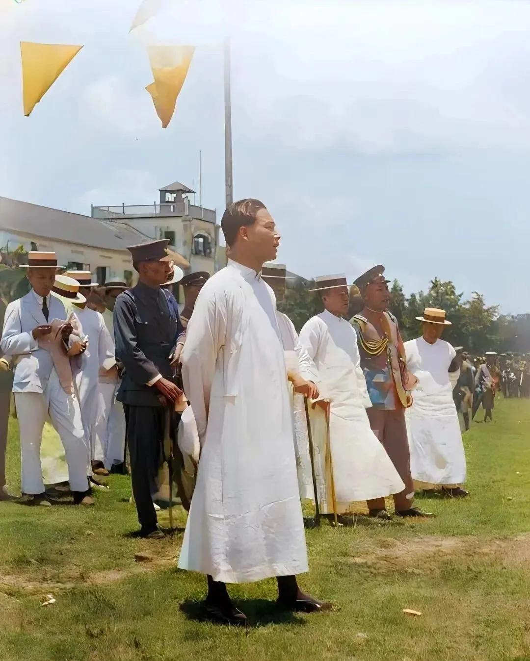 这张草坪上穿长衫看表演的叫礼仪场面,白衣一水儿整齐,草地嫩得能掐出水来,手里扇子一合一合,阳光把边缘烫出金线,那时候讲究体面,现在讲究舒服,规矩变了,心气儿还在。