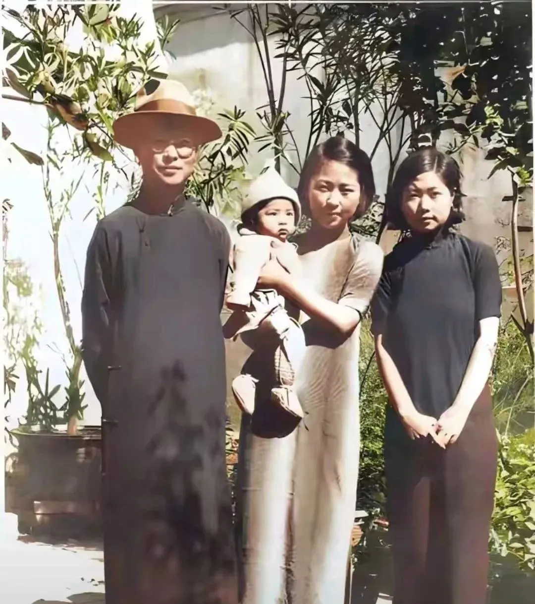 这张小院里的四口人叫日常一隅,草木长得欢,帽檐投下一圈阴影,孩子戴着小尖帽,眼神扎实,女人的短袖被阳光一烤,颜色像熟桃,爸爸站得直,手却有点紧,像第一次照相不知把手搁哪儿。