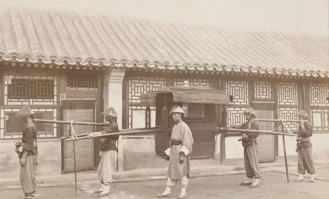 这个大件叫八抬轿,黑布帷子把人裹在里头,四根抬杠抬得齐齐的,轿夫戴斗笠系腿绑带,脚下是青石板路,最讲究的是停轿那一下,前后两根落地要一块儿,管事的在旁边喊着号子,场面像模像样。