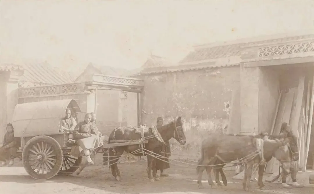 这辆是篷车,蒙着油布,前头两牲口并驾,缰绳分三路牵到车把,老车把式坐在边上叼着烟袋,车轮辘辘一压,墙根碎砖跳两下,以前出门要盘缠,要脚力,现在嘛,手机一点就叫了车,快是快了,路上的故事少了不少。