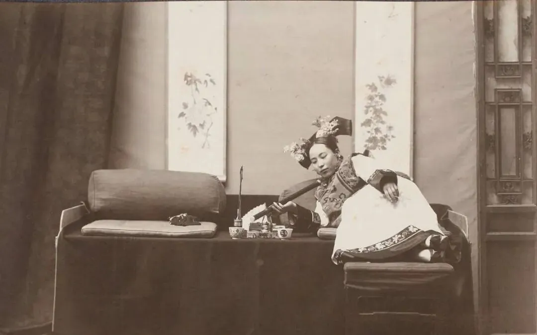 这张小床叫罗汉床,靠枕圆滚滚一对,案上小盏小碟摆得满,烟枪细长,烟锅立在支架上,女子斜倚着,指尖捏火镰,袖口里流苏一溜儿垂下去,屏风上画着花鸟,屋子里静,只有炭火噼啪两声,时光也跟着慢下来。