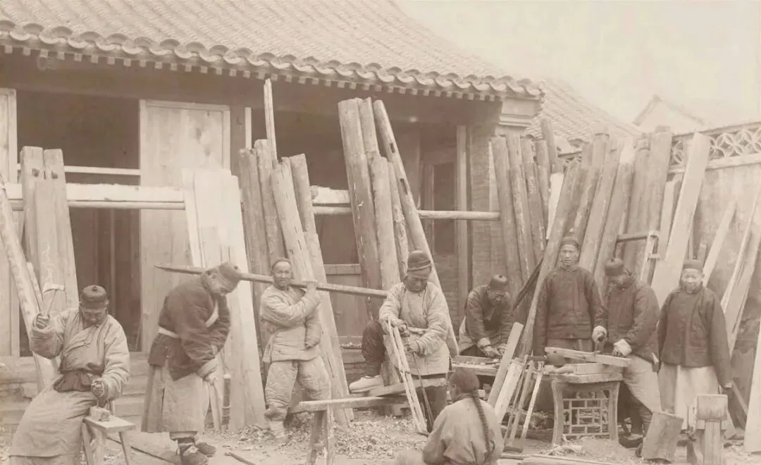 这排院子是木作铺,图中长条板叫顺料,靠墙一人正抡大斧开胚,旁边老匠握着刨子顺木纹推,刨花一卷一卷地飞,地上踩得吱呀响,小徒弟蹲着磨凿,石条蘸水一拉,火星子不见,刀口却亮,那时候做一扇窗要量三回线两回,慢,可耐看。