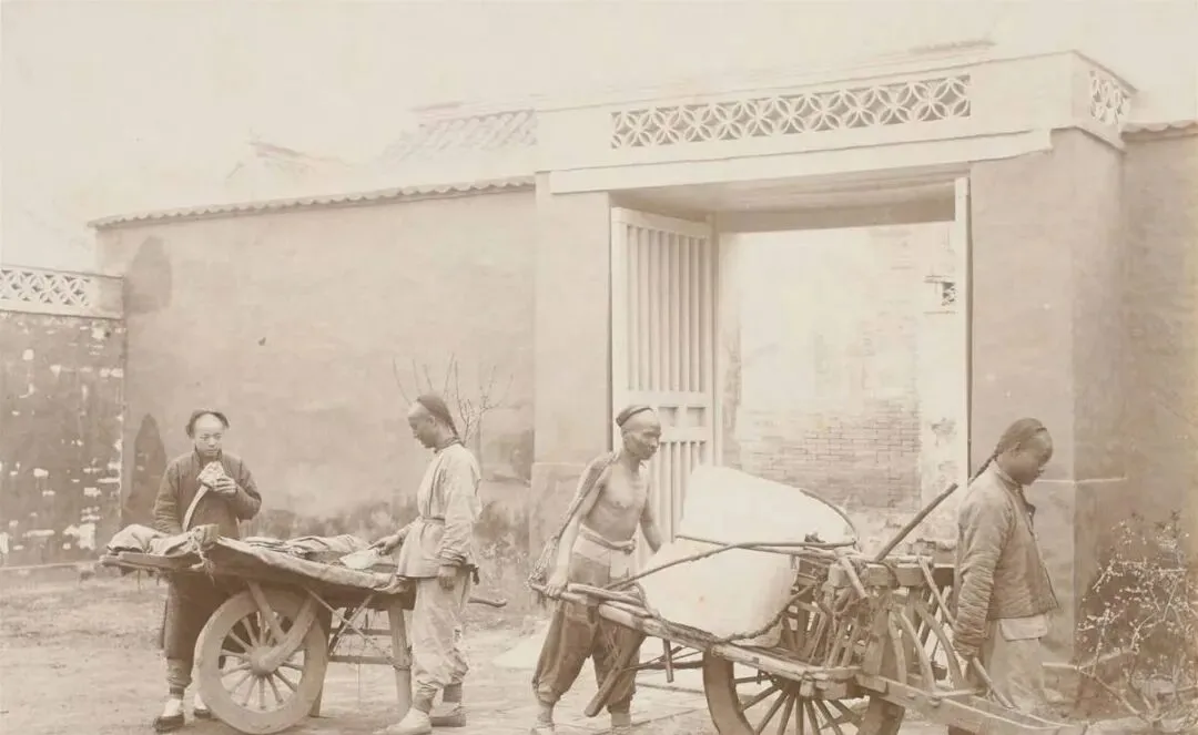 这一处是行当人家的院口,左边独轮车装着杂物,车把裹布,右边的板车压着一大块冰,冰面白得晃眼,拉车的赤膊冒汗,嘴里直喘气,旁边人掀开包袱咬口烧饼,边吃边看路,妈妈说以前冬天买冰回家存进地窖,到了夏天切一块降暑,简单也好用。