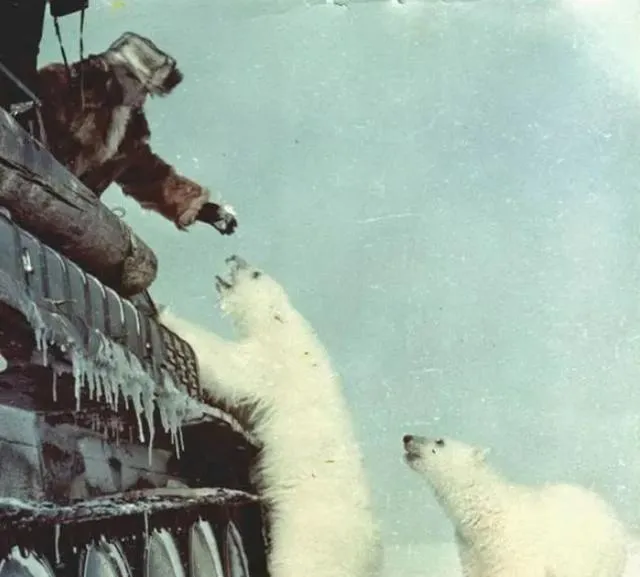 图中这场景叫寒地行军的偶遇,铁皮履带冻得直响,士兵探出身子递食物,白熊前掌搭在装甲板上,鼻尖一耸一耸,冷风呛人,蒸汽从排气口直冒,小时候看画报见过类似一张,爸笑说这玩意跟咱家拖拉机可不是一路,硬是要劲才压得住。