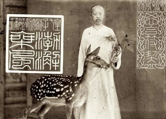 这个庭院照里的人牵着一头梅花鹿,白点子像撒了盐,手里拈一枝松针当饵,鹿脖子往前探,眼神温顺得很,旁边大块大块的篆字印屏,像把气派直接盖在墙上。