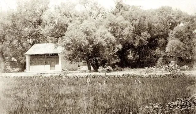 图中这块湿地像菜畦也像水田,矮屋只占一角,茅檐底下风一吹就要晃,水面生着细芽,远处树冠团成一坨一坨,院里不是只有金瓦彩绘,也有要过日子的地气。