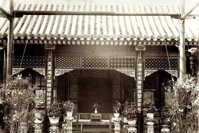 这处前廊摆满了花盆,瓷釉发亮,栏板上刻着细密的菱花纹,匾联写得工整,屋里一张太师椅当着主位,桌上独放一瓶,讲究的人,宁可少,不肯乱。