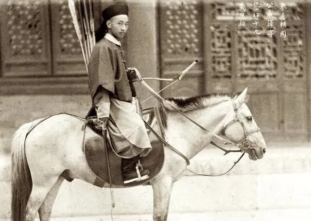 这位少年骑着青骢,鞍桥擦得锃亮,背上一排箭,弓弦贴在肩头,眼神往镜头这边一抬,可有点年纪轻轻的得意,爷爷说,那时候练骑射是规矩,马掌敲青砖的响动,远远就来。