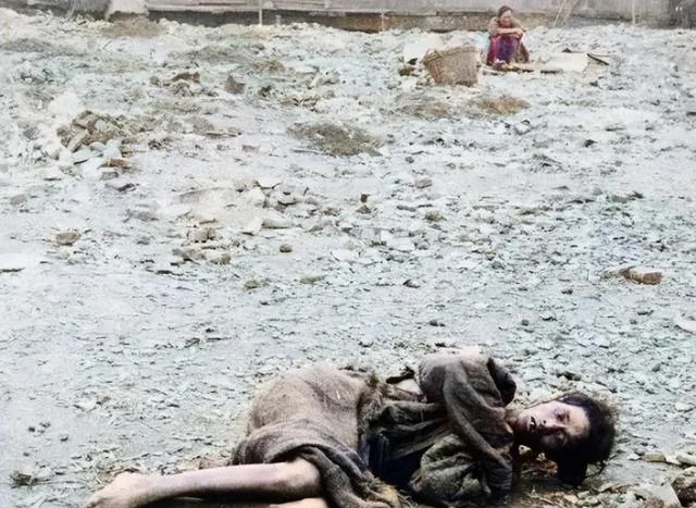 这幅是最扎心的一张,这位瘦骨嶙峋的人蜷在地上,破毡子盖到胸口,远处还有个挑筐的人影,地面像被风刮过的灰,爷爷不爱让我们多看,说以前一场灾就能把一家人吹散,现在冰箱里有馒头心里就不慌。