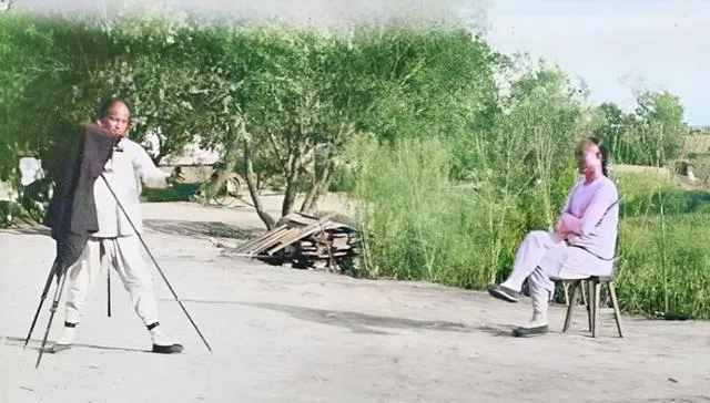 这位把黑布蒙在头上的叫影相师,三脚架撑得老高,前头是大木箱相机,受照的人端端正正坐着,手不敢乱动,小时候我在村口见过照证件照的,嘴里念着别眨眼别动,这规矩一听就懂。