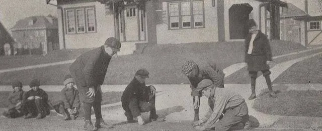 地上蹲着一圈孩子,手里捏的是玻璃球,叫弹子,袖口卷到肘,目光全盯在坑里那一颗亮的,谁赢了就把球揣兜里,回家过门槛还得倒出来给娘数,两三个字的得意能挂好几天。