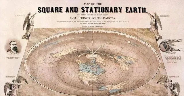 这纸上画的怪东西叫平地说地图,把地画成四四方方又像个盆,四角站着天使样的人物,字多得晕头,读过两行就懂个理儿,旧时也有书呆子想得远又想偏,现在打开手机一搜就能对上正经答案。