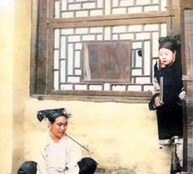 这两位女子嘴里也叼着细长烟管,窗棂是冰裂纹样的木格,墙面泛黄,脚下穿着小巧的绣鞋,坐着那位低着眼,靠窗的把烟锅抬得高一些,像在听里头人说话,动作都慢,看着就安静。
