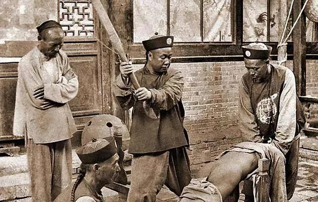 这几个人的帽子是补服团帽,手里举着板子的叫廷杖,木条宽厚,刑房里窗纸破了几处,站着的两位神情冷硬,被押的趴在凳上,历史书里一句话带过的疼,在这张照片里能听见。