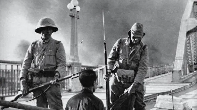 桥面上烟雾压着天,两名士兵端着带刺刀的枪,面前跪着个人影,护栏的灯柱像远处的钉子,照片没声音,可心里知道有风有喊,爷爷说那年过桥得找绕道,现在这桥上都是拍婚纱的。