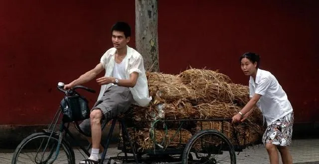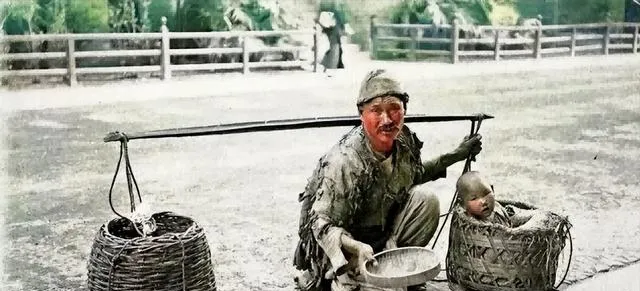 图中这位挑担的叫肩挑客,一根扁担压在肩窝里,两边竹篓绳结打得瓷实,一个装货,一个竟让孩子蜷着坐里头,男人脸上糊着泥点,帽檐塌着,手里还端个小盆,人一蹲一笑,牙齿白得扎眼,奶奶看见这种照片就嘀咕一句,日子再紧也得把娃护住点暖气。