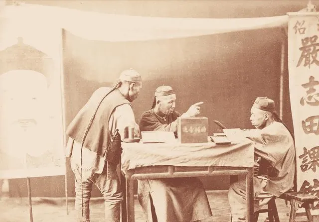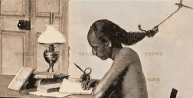 图里这动作叫悬梁刺股,辫子后拴着,身子前倾着写字,桌上一盏灯,纸堆起一小摞,眼神往下钉得紧,老师总拿这张图当例子,唠叨一句以前人怎么拼命读书,现在孩子有台灯有椅垫,困了还得让眼睛眯一会儿才行。