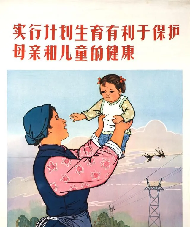 这幅画是宣传画,大字红得扎眼,女人把娃往上举,衣袖上开了花,背景云朵松软,电线杆立着,口号直来直去,妈说那几年墙上巷口都贴,早上出门一抬头就能看见,话糙但路子清。