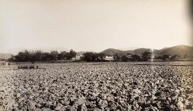这一片翻起的旱田,土疙瘩攒成了一地小山,远处屋脊压着山线,地头若有水光,农人脚步从画外绕过去就能想见,爷爷说以前靠天收,现在靠机器,收成都多了,可雨一来大家还是先抬头看看天色。