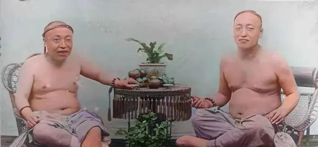这两位半躺在藤椅上,桌上小茶具一圈,叫夏日纳凉照,肚皮在光下一闪一闪,身后粉墙干净,扇子横在手里不摇,外婆打趣说,有钱人的热也得散一散,我们小院里一盆井水就能把夜撑过去。
