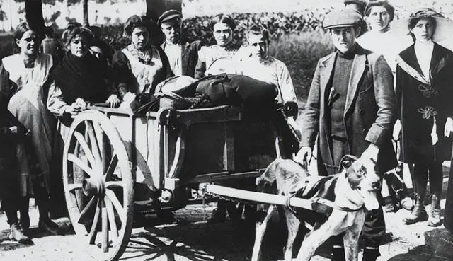 这张里是一辆木轮小车,前面一条狗拉着,狗胸前的皮带勒得紧,车上摞着铺盖锅盆,人围在旁边不笑不说话,脚下的地面有点潮,战火一来的时候家底就这么上路,那会儿没有导航,认着人群和天光走,现在看公路长得直,心里却不那么踏实。