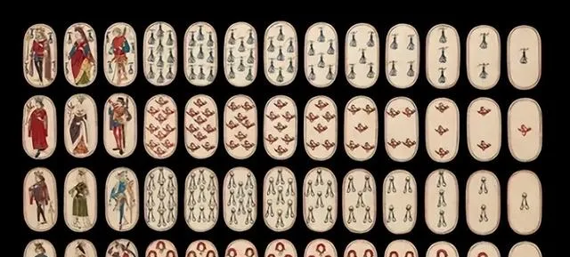这排排画着人像和奇怪符号的牌,就是一副老掉牙的扑克牌样式,椭圆边角,颜色偏淡,衣袍上细纹多得吓人,拿在手里估计糙不得,稍一抹就掉色,打牌这事古今都一样,手指一抖就能把心事露出去,这副要是上了桌,恐怕大家先不玩,光看画就看半天。