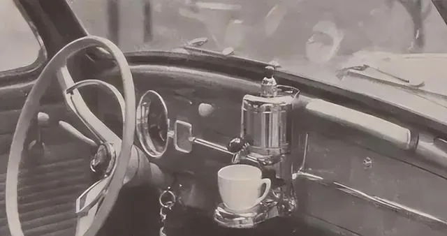 这辆老车的中控旁边硬生生装了一台小咖啡机,金属壳亮得能照人,杯子卡在支架里,估摸着一脚油门一脚刹车都得护着它,想想那年头的人边赶路边煮咖啡,讲究劲儿比我们还野,外面风沙大,车里香味不散,出门就像搬了半个厨房。